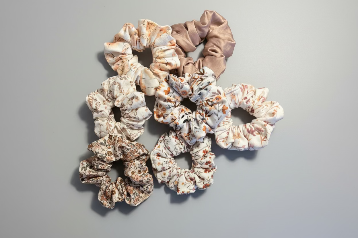 Handgemachte Scrunchies in verschiedenen Farben, Stoffen und Designs – schlicht, zeitlos und mit Liebe gefertigt.